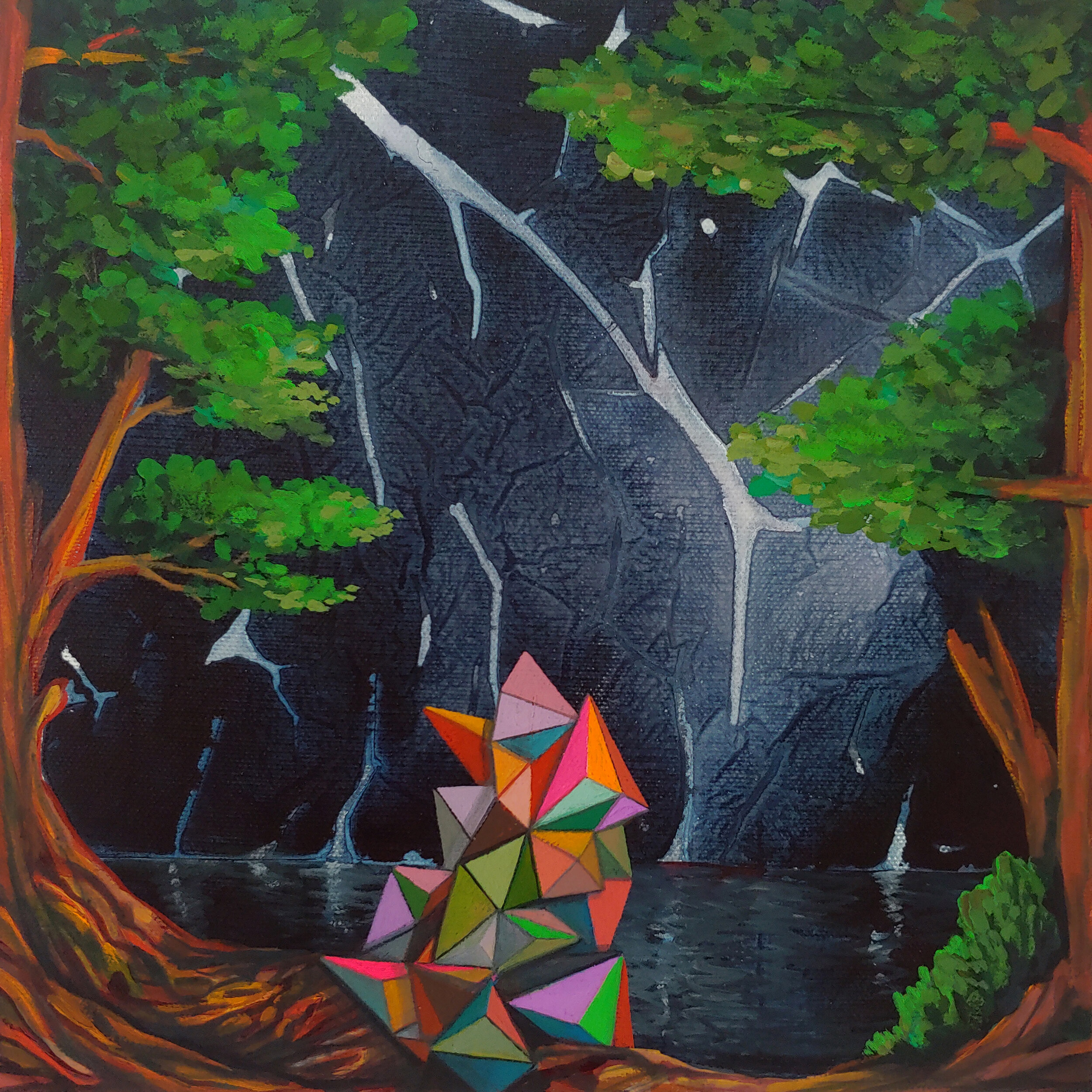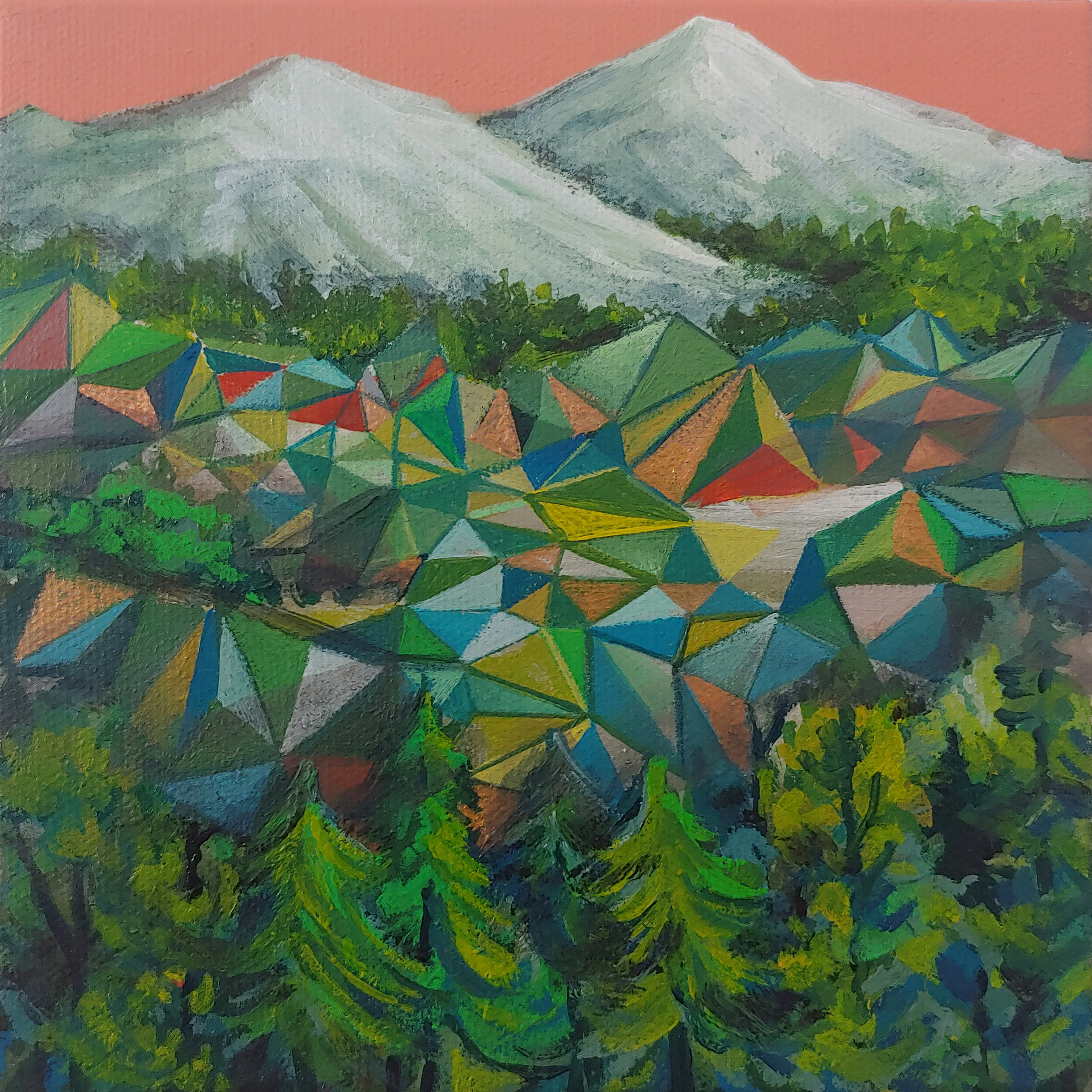 I recently finished a large commission that incorporated my abstract geometry with my more impressionist landscape style and I really loved the results. I decided to continue to investigate this style and create a series of small works exploring the juxtaposition of hard geometric shapes with the softer strokes of an impressionist landscape style. All work is created from improvisation and the only references are from past experiences hiking through the Pacific Northwest. This will be a limited series and all work will be for sale here in the shop. I hope you enjoy them!